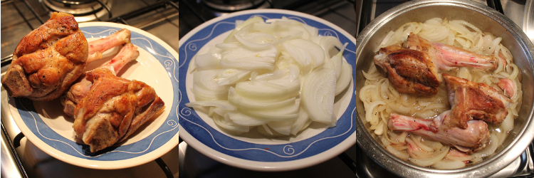 While the meat is colouring, take the head of garlic apart but don’t peel the cloves, they will steam into a lovely mild pulp in their pink jackets. Peel the onions and cut them in half, then into slices (not too thinly, or they’ll burn).