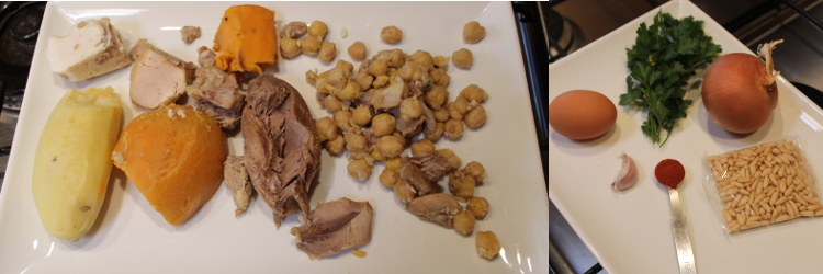 Take your leftovers and mortar and pestle them in manageable batches. (I don’t include the fat at this stage because I prefer to finely chop it rather than squash it). You want things to be chunky but not whole; it isn’t very taxing, nor is it a precise art, so smoosh to please yourself.  In a large bowl, mix the onion, garlic and parsley into the mashed putxero leftovers. Add the finely chopped fat and the pine nuts. Mix well.