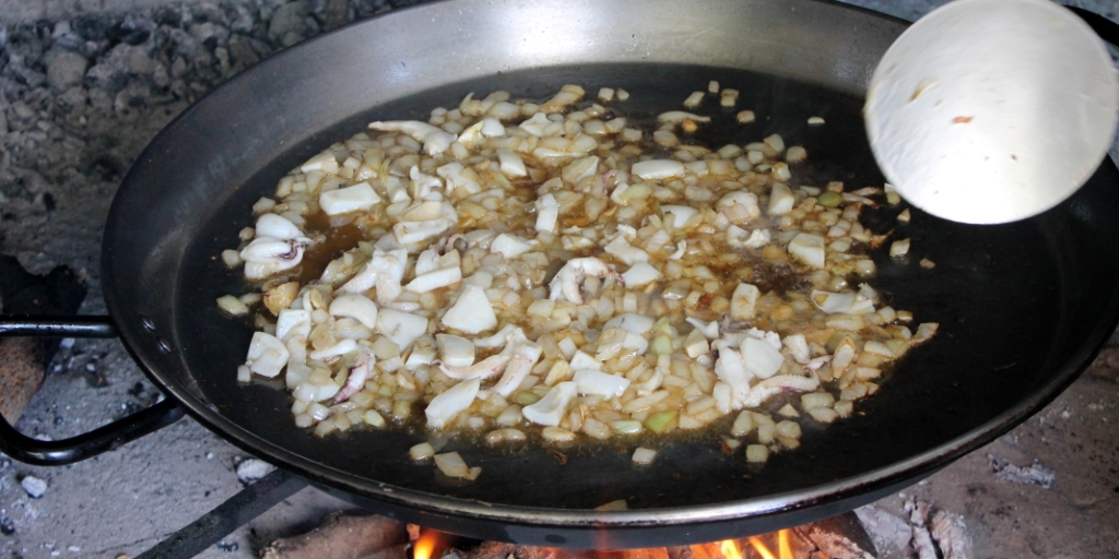 onion for a couple of minutes, or until they soften slightly. Add the cuttlefish. It’s a good idea to keep things moving throughout these early stages so that nothing catches and burns. Eduardo also mentioned that when he buys fresh cuttlefish or squid, he scalds it and then lets it dry before frying it,