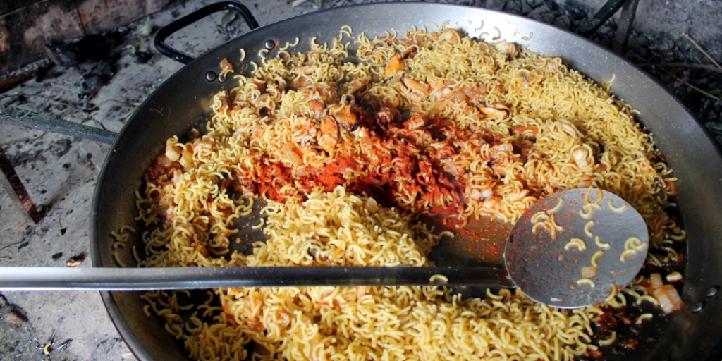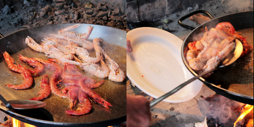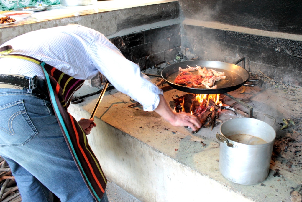 Eduardo cooks over an open fire, which is difficult and can be dangerous. If you can get hold of a paella gas ring and paella pan, then I would use them. Otherwise, if you scale down the recipe, you could probably do a pretty good version for 2 or 3 people in a large frying pan over a gas flame.