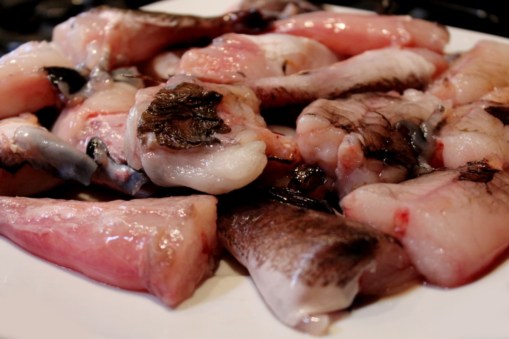 them home with the heads on, which you can then scissor off and freeze for the best fish stock ever. The cuts that go into the stew are the whole tail and the loin, both with the bone in.