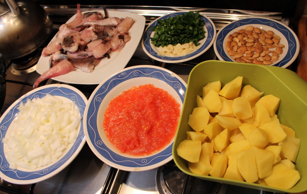 The frozen stuff does not taste the same, and Iaia refuses to use it. Try to buy smaller fish as their muscles are less fibrous and far more pleasant to eat. Leave some of the skin on if you don’t find it irksome, as this will act as a natural thickening agent for the sauce and enhance its sweet, fishy goodness.