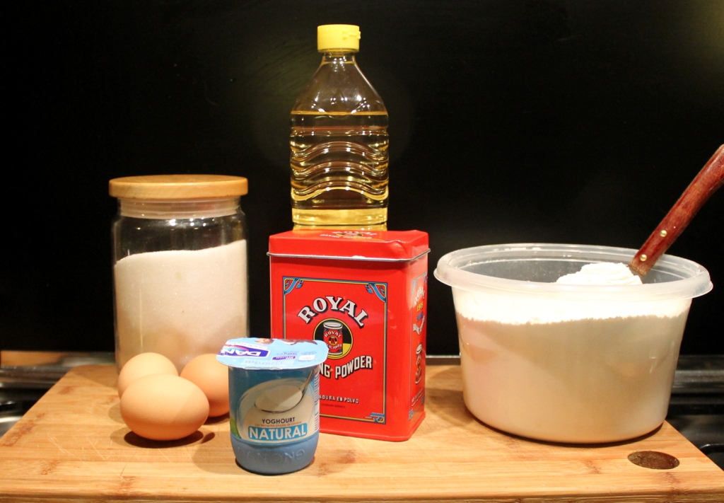 A simple sponge based on the yoghurt pot measure, which in Spain is 125ml. If you have bigger pots, you might need to add another egg and a bit more baking powder. I cooked this one last night, and it has already been quaffed by three teenage girls. I might also have had a piece or two myself.