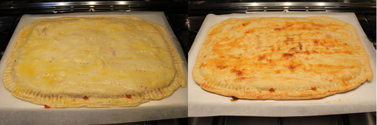 Use a fork to press the edges together and prick the top surface. Brush with a beaten egg and pop it into the oven for about 40 minutes, checking from time to time. UntfinisheditledIf you find the base is cooked, but the top is still very pale, you can switch to the grill only, keeping your eye on the pizza to make sure it doesn’t get frazzled. Allow to cool completely before serving (it’s even better the next day!)serving
