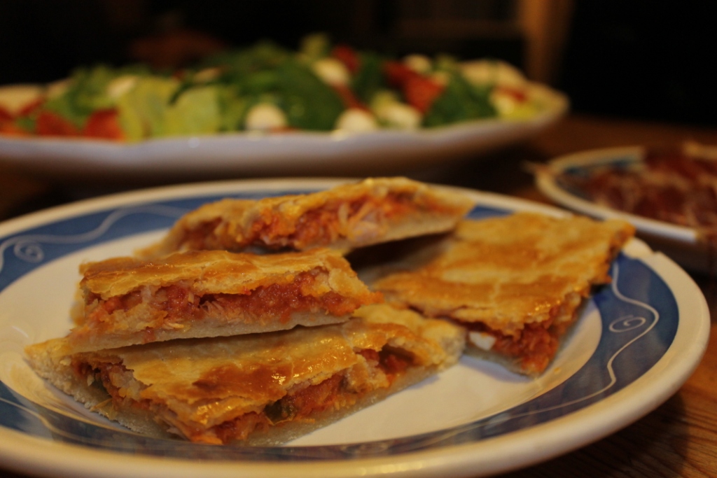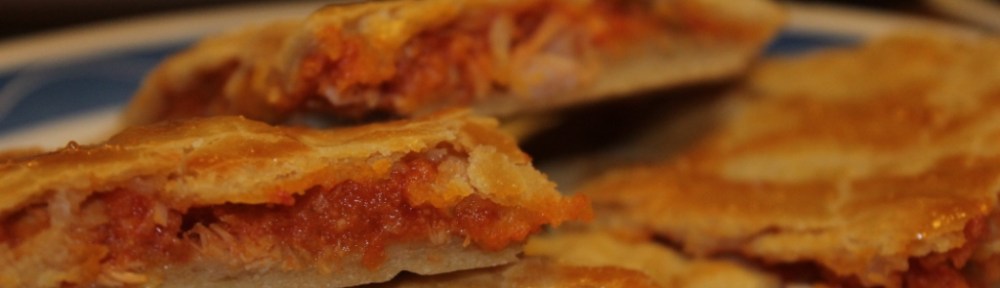 A compulsory part of any major meal here is the picaeta, which is a rough equivalent to “nibbles”.  In our family, one of the most appreciated nibble foods (apart from the ubiquitous home-roasted peanuts, olives and crisps), is Auntie Joaquina’s Coca Gallega, a pizza-like pasty which is cut up into squares and devoured almost as soon as it gets to the table.