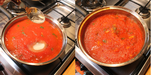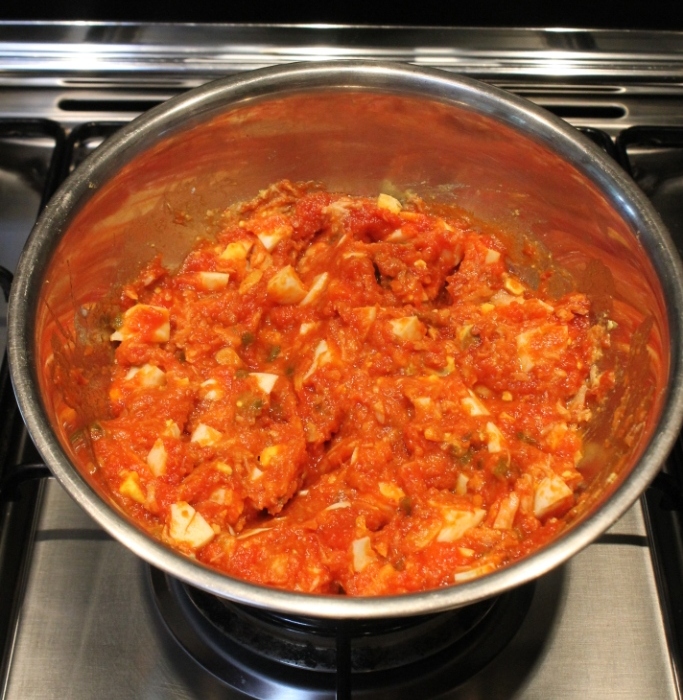 This recipe is easy, although you should remember to do the basic tomato mix the day before to ensure that it has the right texture and depth of flavour. Feel free to leave out the tuna if you don’t like it, or don’t want to consume the noble fish, and (speaking from experience) it is no great disaster if you forget to add the pine nuts, although they do provide good little nubby bits to bite.