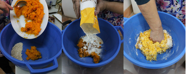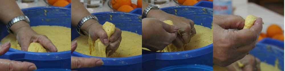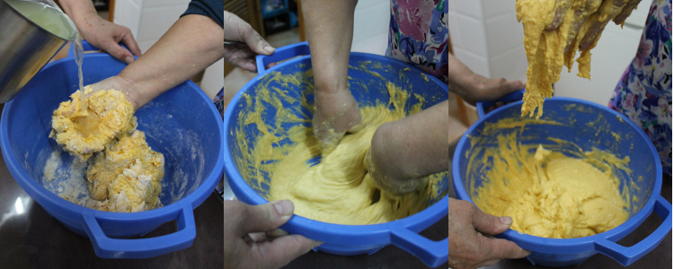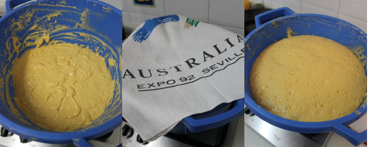 In a large (really large) bowl or bucket, hand mix the crumbled fresh yeast, pumpkin and beaten egg. Add about 300g of flour and start working it into the orange pulp with energy.  Once the first addition of flour is mixed in, keep adding bit by bit, alternating with small splashes of the cooking liquid until you have used about 750g of flour.mixing1The finished dough is really very soft, so you will end up adding quite a bit of liquid. There is no specific measurement, but the texture before the dough rises is similar to thick mud – the kind that squelches most beautifully between your toes. mixing2 Cover the bowl with a tea towel (Iaia has asked me to point out that hers is from the Australia pavilion at the 1992 Expo Seville, before Oscar had met me) and set it aside for a couple of hours. You will be amazed at how much the mixture rises, all bubbly and spongy with the yeast!leudar