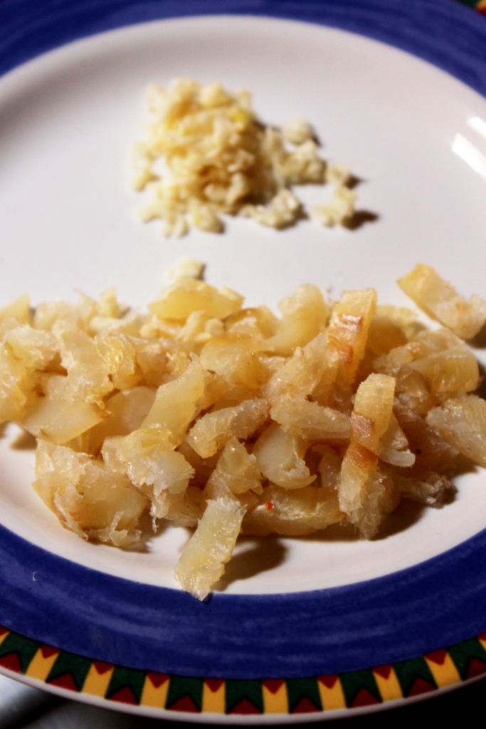 Chop your garlic up very finely and slice the cod into small pieces. Mix into the peppers. IMG_2849