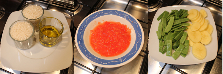 Pop the oven on at 200ºC and prep by measuring out your rice and oil, grating one of your tomatoes, slicing the potatoes, breaking the beans into pieces and putting your water on to boil. The amount of water is directly dependent on the amount of rice you use and the type of dish you cook in. If using a metal tray, use two glasses of water for every glass of rice. For ceramic dishes, hold back half a glass or so of liquid. For this particular recipe, I used 750ml of water for 400g of rice.