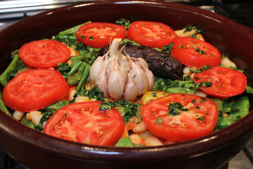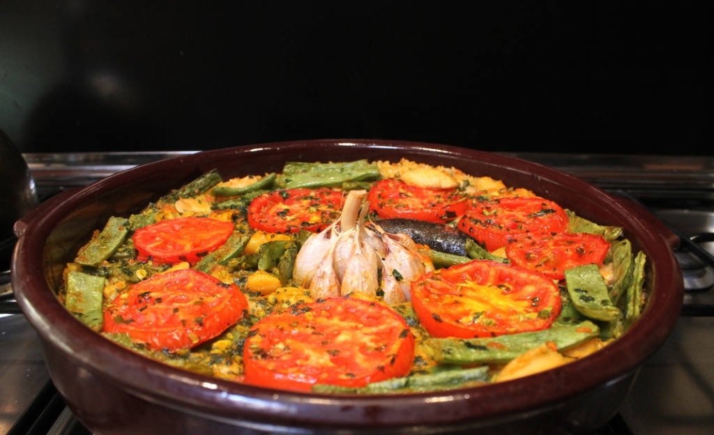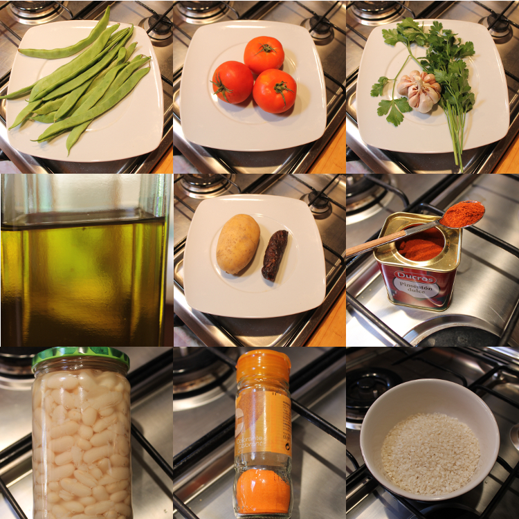 In the same oil, lightly fry your sliced potatoes. Remove and place over the rice, distributing the pieces evenly. Gently fry your green beans and when they look bright green and slick, add the grated tomato and white beans. Fry for a minute or two longer, then in goes the paprika for a quick swirl. Remove from the heat and pour over the potatoes and rice, spreading things evenly over the whole dish. Slice the remaining tomatoes thickly and place them on top of the other ingredients. Nestle the head of garlic in the middle and (optionally) place the sausage right next to it. Spoon your “picadillo” over everything. Sprinkle a bit of food colouring on top to get the Spanish yellow that people here prefer to white when it comes to rice.
