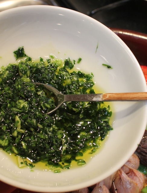 You will also need to make what we call a “picadillo”, which is a bashed-up clove of garlic with a small bunch of parsley and a bit of oil added. I use a mortar and pestle, but finely chopping is good too. Set this aside for a moment while you get on with the frying and assembling.