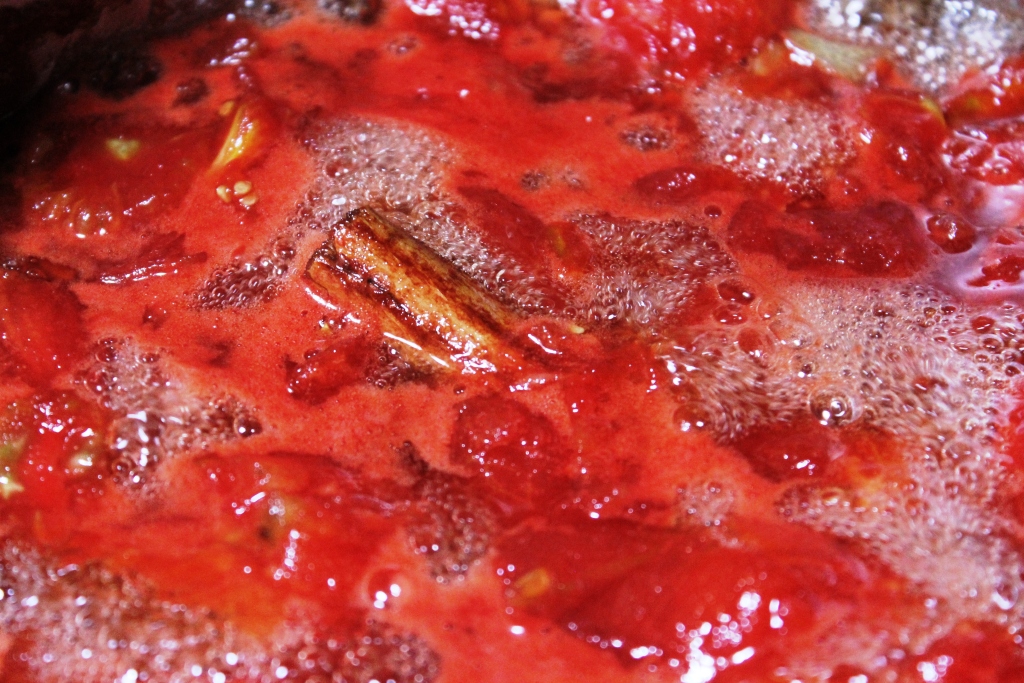 burning. While the tomatoes are heating and the sugar is melting, use a potato peeler to zest the lemon and cut the strips into smallish pieces. Add to the pan along with the cinnamon stick and bring everything to a jolly boil. I allowed this lot to boil hard until it was reduced by about half, then poured it into sterilised